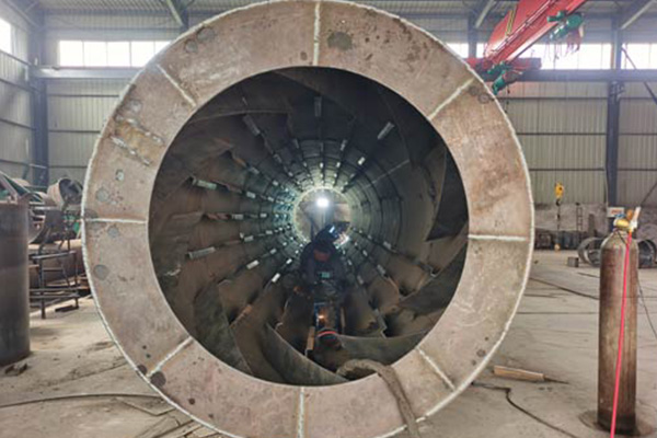 鐵屑通過(guò)傳送帶送入烘干機(jī)后,與熱源燃燒產(chǎn)生的熱空氣接觸,此時(shí)冰塊融化或者水分會(huì)逐漸蒸發(fā),由于烘干機(jī)內(nèi)設(shè)置有揚(yáng)料板,會(huì)在筒體轉(zhuǎn)動(dòng)的作用下不斷將鐵屑帶起,所以會(huì)加快水分蒸發(fā)的過(guò)程,使鐵屑快速干燥,干燥后的鐵屑從烘干機(jī)尾部落下由輸送帶送至倉(cāng)庫(kù)中,烘干產(chǎn)生的水蒸氣則被引風(fēng)機(jī)抽出烘干機(jī)外排放,由于該機(jī)烘干過(guò)程中主要是鐵屑和水分,幾乎不產(chǎn)生其他廢氣,從節(jié)省成本方面考慮,可以不設(shè)置除塵器,除非有嚴(yán)格的要求時(shí),再根據(jù)烘干機(jī)型號(hào)配備相應(yīng)的除塵器。