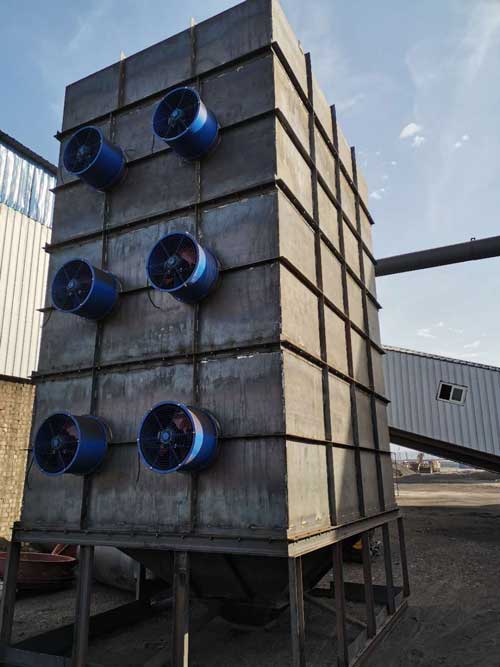 烘干后的熱蘭炭被送入蘭炭冷卻機種,然后冷風(fēng)開啟對蘭炭進行均勻降溫,由于采用冷氣流的方式,降溫效率高,可在短時間內(nèi)將蘭炭從一百多度降溫至40度,這個溫度屬于蘭炭的安全溫度,可以正常的儲存和裝袋,對生產(chǎn)不造成任何影響。